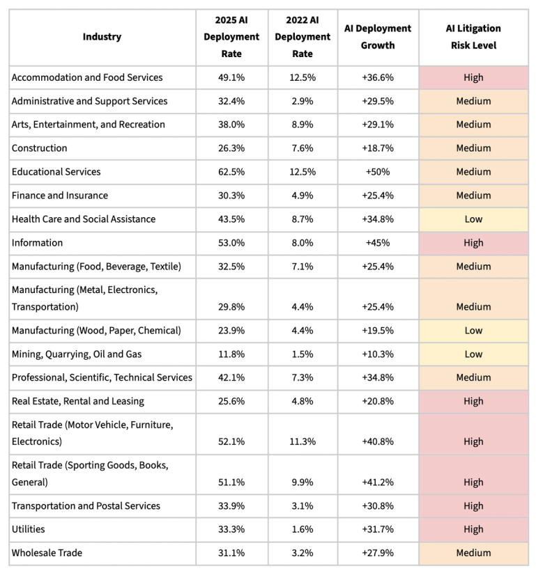 - Below is an overview of AI deployment rates per industry (NAICS codes) and a view of AI litigation risk per industry based on our data.